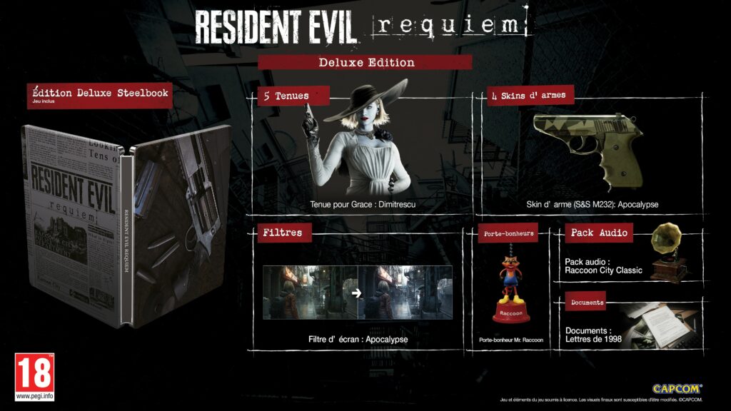 - Deux éditions épiques : Resident Evil Requiem est disponible en éditions Standard et Deluxe. L’édition Deluxe comprendra le même jeu de base que l’édition Standard, ainsi qu’un pack exclusif de cinq costumes, quatre skins d’armes, deux filtres d’écran, deux porte-bonheurs et bien plus encore !